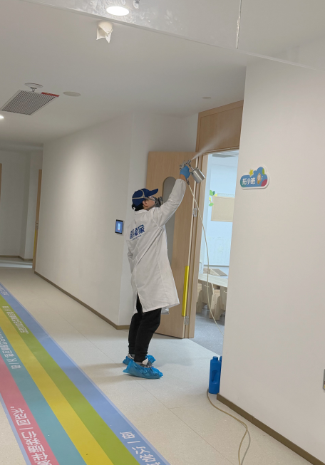 本次服務(wù)的托育園總面積 1400㎡,涵蓋多個(gè)教學(xué)活動(dòng)室、幼兒睡眠區(qū)、公共游戲區(qū)及配套功能室,裝修后存在課桌椅、儲(chǔ)物柜、軟包教具、PVC 地墊、墻面涂料等多重甲醛釋放源,且因空間布局分散、兒童接觸場(chǎng)景多,對(duì)治理藥劑的安全性、施工的精細(xì)化要求遠(yuǎn)高于普通場(chǎng)所。我們的團(tuán)隊(duì)以《托育機(jī)構(gòu)衛(wèi)生評(píng)價(jià)基本標(biāo)準(zhǔn)》《室內(nèi)空氣質(zhì)量標(biāo)準(zhǔn)》為核心依據(jù),參照比國(guó)標(biāo)嚴(yán)苛 20% 的母嬰級(jí)治理要求,量身制定「精準(zhǔn)勘測(cè) - 分域治理 - 源頭分解 - 長(zhǎng)效防護(hù)」的全流程除醛方案,全程遵循安全無(wú)刺激、施工無(wú)死角、效果可驗(yàn)證的三大原則,確保治理后可快速投入使用。