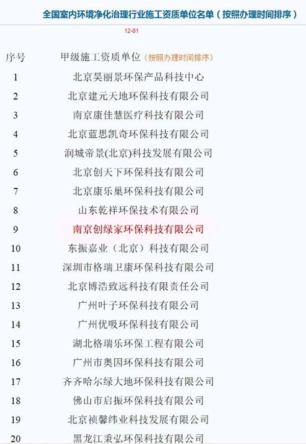 恭喜南京創(chuàng)綠家環(huán)??萍加邢薰精@得全國室內(nèi)環(huán)境凈化治理行業(yè)甲級(jí)施工資質(zhì)證書?。。∧壳叭珖覂?nèi)環(huán)境凈化治理行業(yè)具有甲級(jí)施工資質(zhì)的企業(yè)僅有20家,創(chuàng)綠家是第九位獲得全國甲級(jí)施工資質(zhì)的公司! 此外,創(chuàng)綠家環(huán)??萍加邢薰具€是中國室內(nèi)裝飾協(xié)會(huì)室內(nèi)環(huán)境凈化治理委員會(huì)會(huì)員單位、中國建筑室內(nèi)生態(tài)環(huán)境綜合研究課題承擔(dān)企業(yè)、全國室內(nèi)車內(nèi)環(huán)境凈化治理先進(jìn)單位!