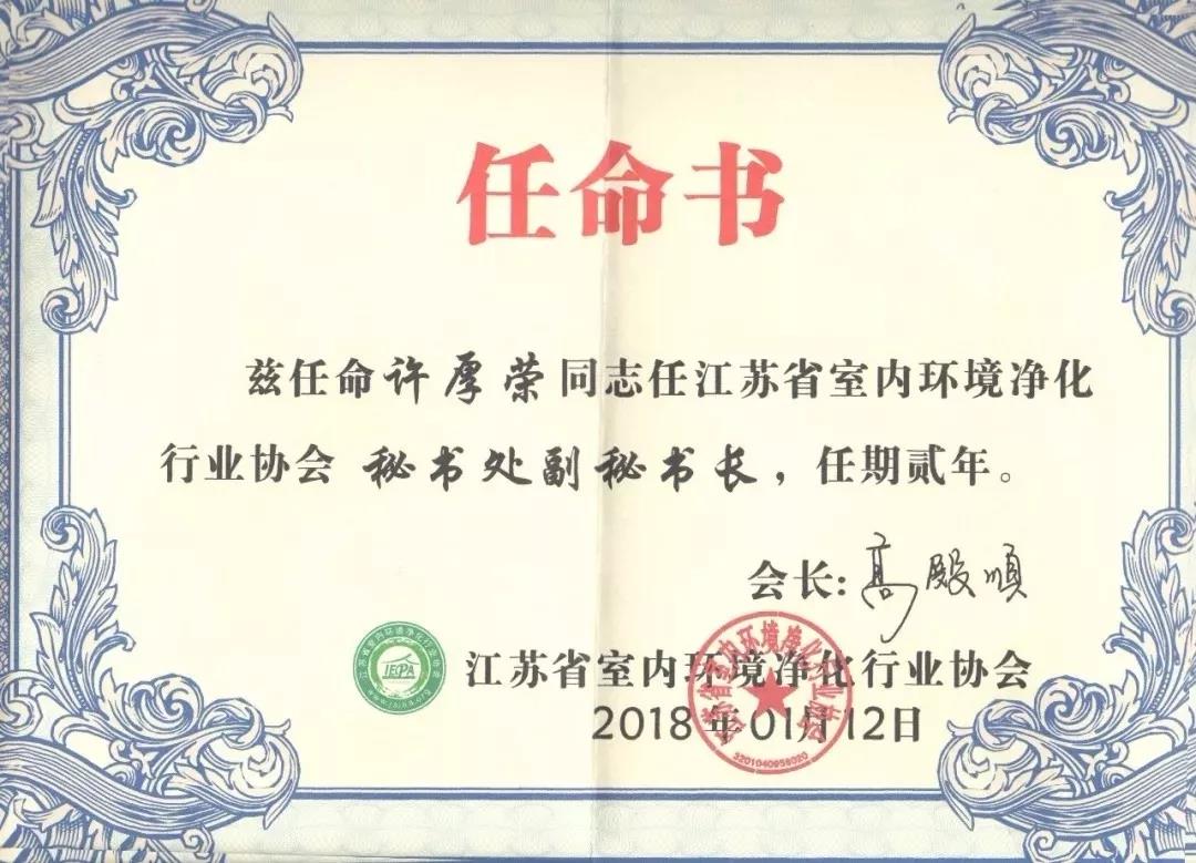 2018年1月13日,“中國室內(nèi)環(huán)境凈化行業(yè)協(xié)會(huì)聯(lián)盟”與“江蘇省室內(nèi)環(huán)境凈化行業(yè)協(xié)會(huì)”聯(lián)合舉辦的首屆“中國室內(nèi)環(huán)保行業(yè)創(chuàng)新創(chuàng)優(yōu)、融合發(fā)展”高峰技術(shù)年會(huì)在中國南京召開。協(xié)會(huì)隆重表彰了2017年度行業(yè)“突出貢獻(xiàn)獎(jiǎng)”——許厚榮,任命其為江蘇省室內(nèi)環(huán)境凈化行業(yè)協(xié)會(huì)秘書處副秘書長。
