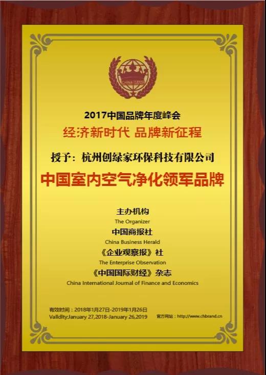 2018年1月26日-28日,由中國商報(bào)社、《企業(yè)觀察報(bào)》社和《中國國際財(cái)經(jīng)》雜志聯(lián)合主辦的“2017中國品牌年度峰會(huì)”在京隆重舉行。杭州創(chuàng)綠家環(huán)??萍加邢薰緲s獲“中國室內(nèi)空氣凈化領(lǐng)軍品牌”殊榮。