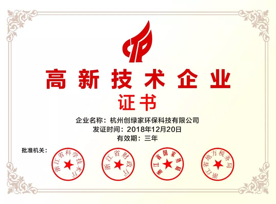 2018年12月,杭州創(chuàng)綠家環(huán)??萍加邢薰颈徽J(rèn)定為國家高新技術(shù)企業(yè)。