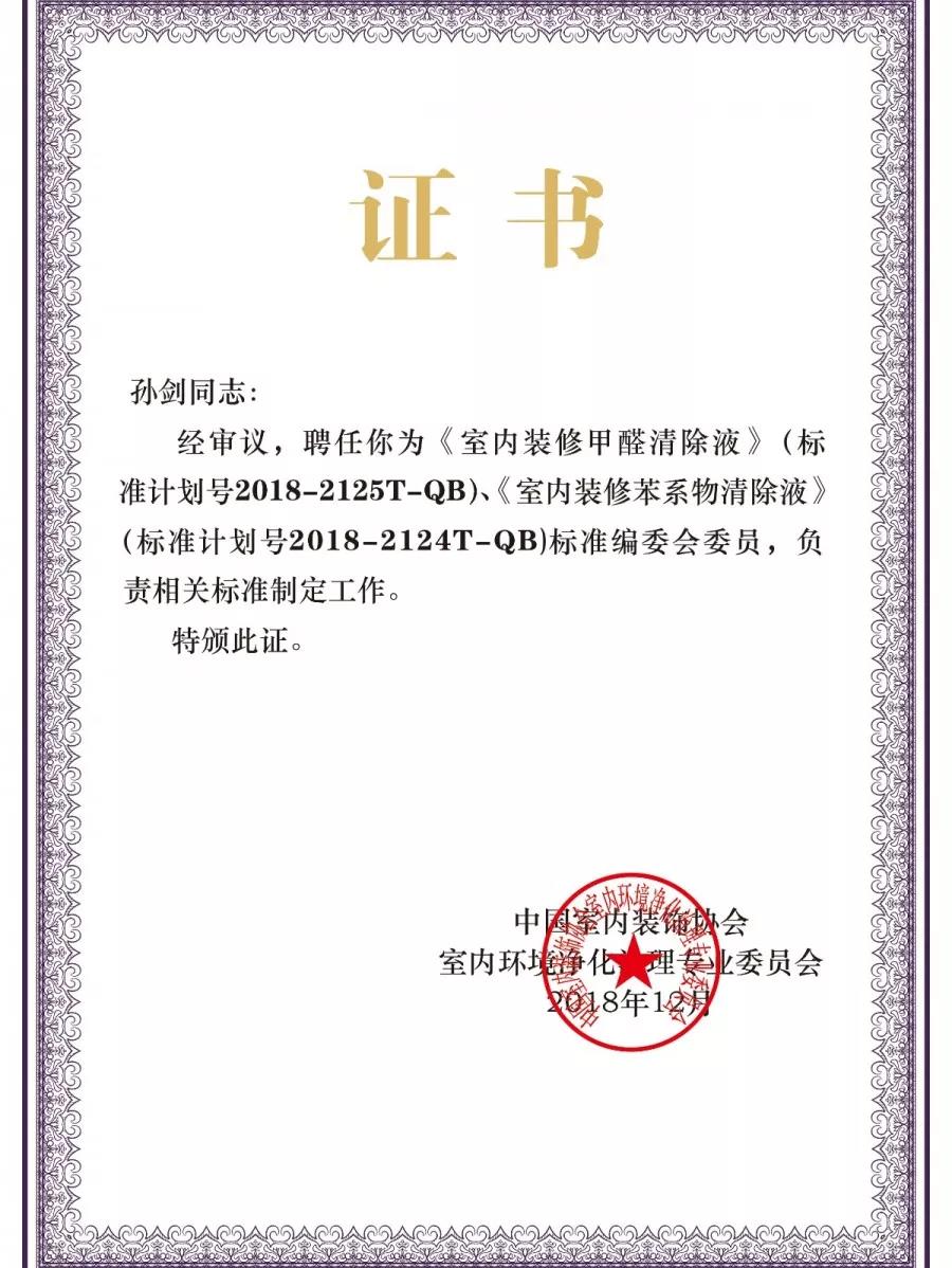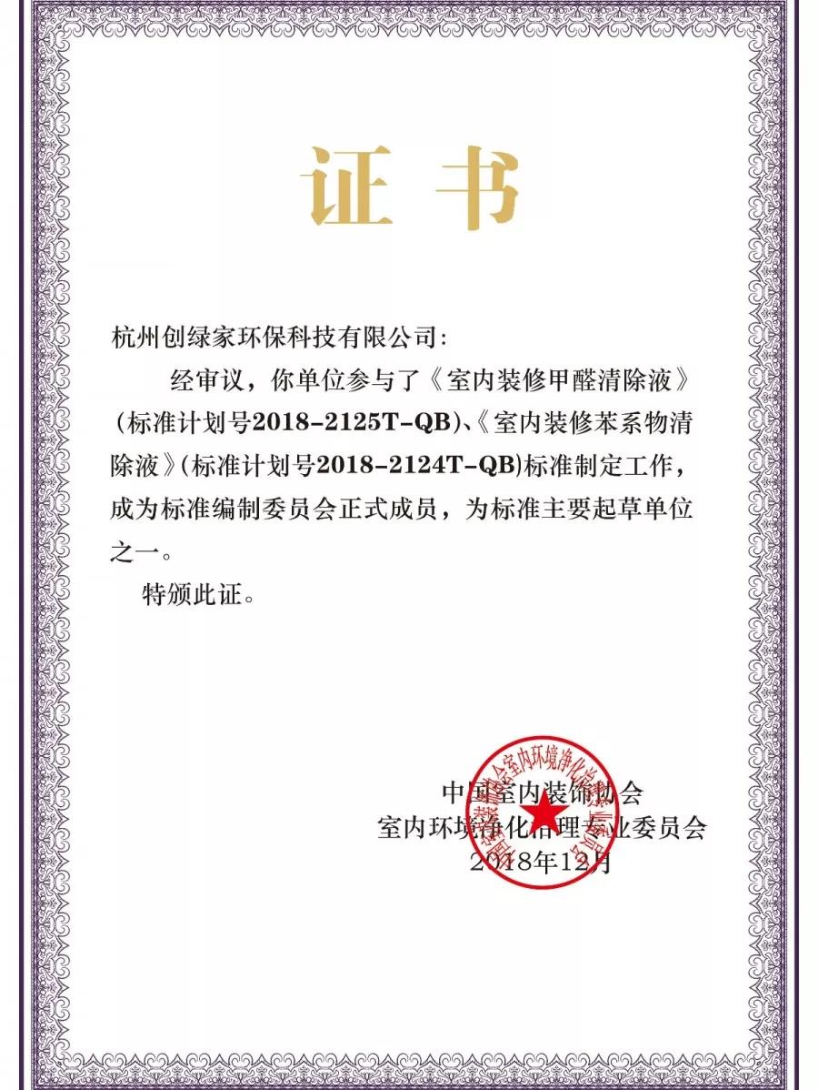 2018年12月19日,中國室內(nèi)環(huán)境凈化治理行業(yè)第五屆技術(shù)創(chuàng)新分享會(huì)在北京新聞大廈長安發(fā)布廳舉行。創(chuàng)綠家環(huán)保成為《室內(nèi)裝修甲醛清除液》、《室內(nèi)裝修苯系物清除液》標(biāo)準(zhǔn)內(nèi)編制委員會(huì)正式成員,為標(biāo)準(zhǔn)主要起草單位之一,創(chuàng)綠家環(huán)??偛脤O劍被聘任為該標(biāo)準(zhǔn)編委會(huì)委員。