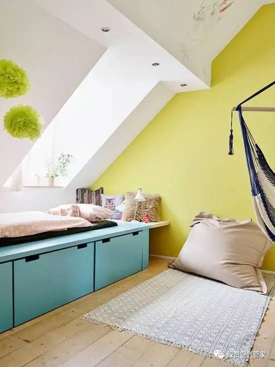 小編的話:薄荷綠的漆面粉刷閣樓墻壁,為低矮的空間增添明亮的清新,盡可能的加大采光空間,引入陽(yáng)光,多彩絢麗的軟裝搭配出一個(gè)歡樂(lè)的空間氛圍。