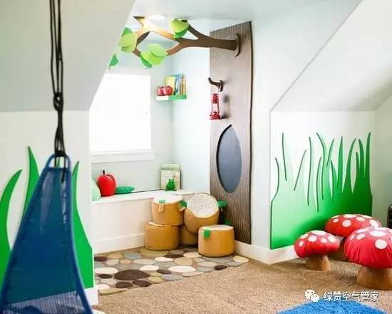 小編的話:墻面的綠草和舒適自然的小蘑菇裝飾以及仿真的鵝卵石地毯等營(yíng)造出一個(gè)放佛生活在自然世界的小小空間,大樹(shù)木上橫叉出小枝椏生動(dòng)無(wú)比。